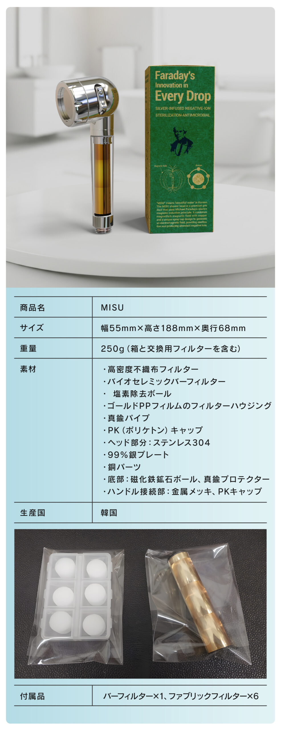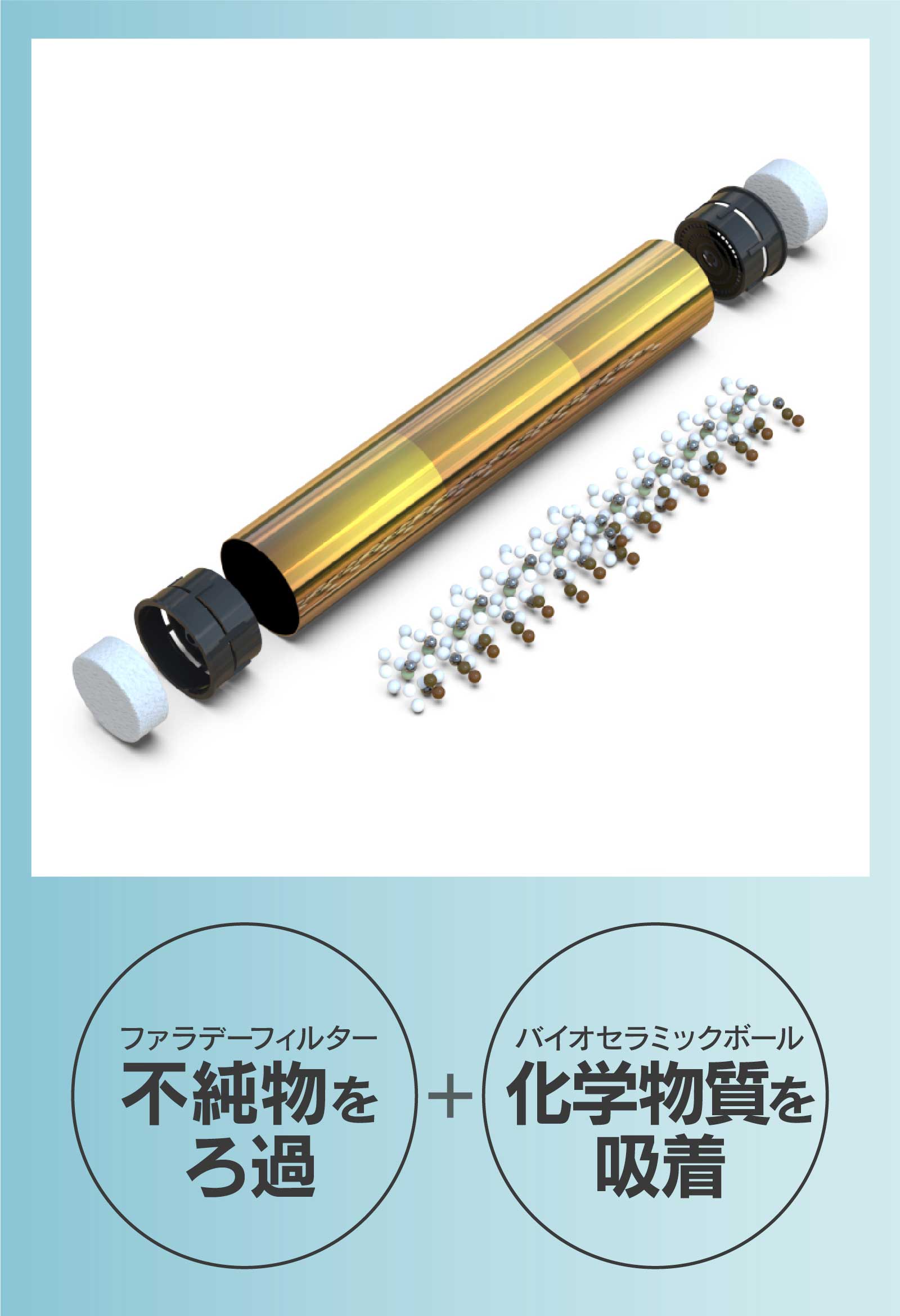 ミネラル補充や抗菌のためバーフィルターと銀素材を追加し、水をさらに細分化してマイナスイオンを活性化させるためPK部品も一緒に採用しました。